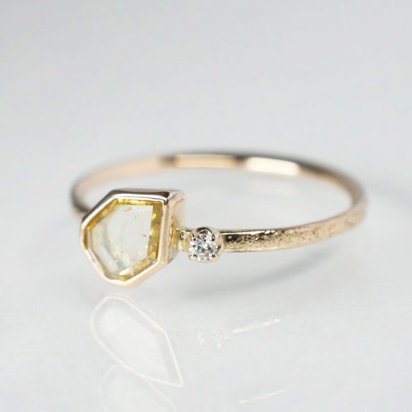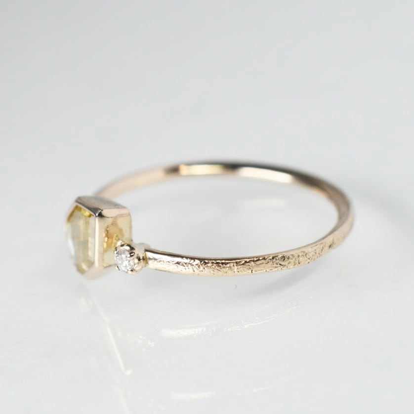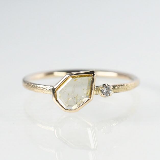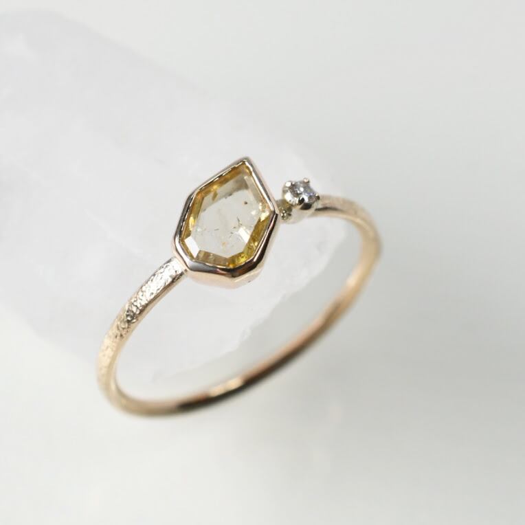 今回使用したイエローダイヤモンドは、柔らかなイエローで個性的なファンシーカットが特徴的です。