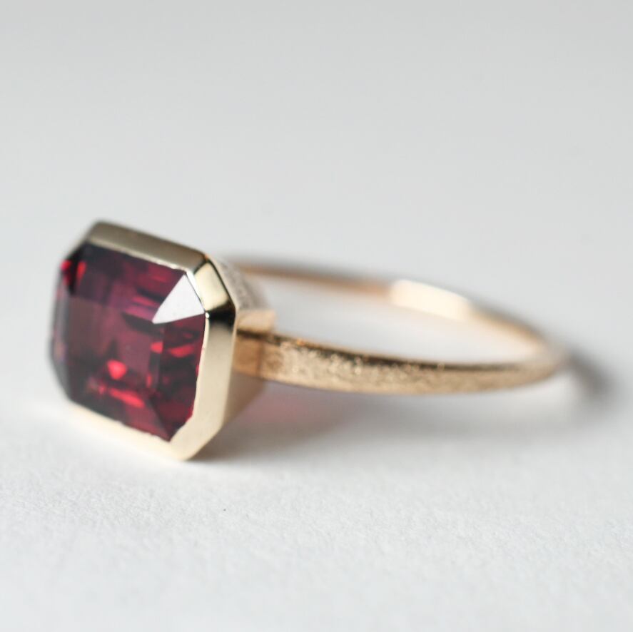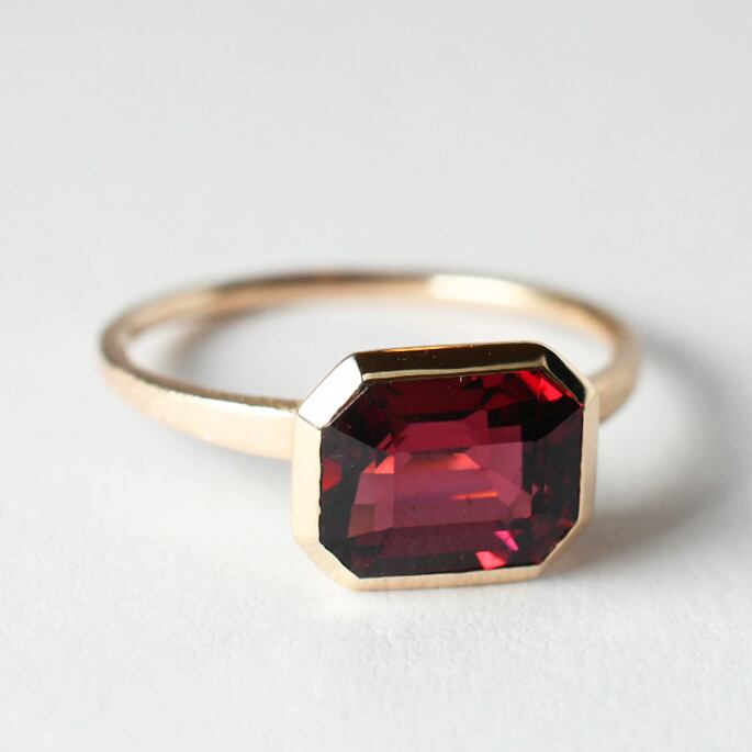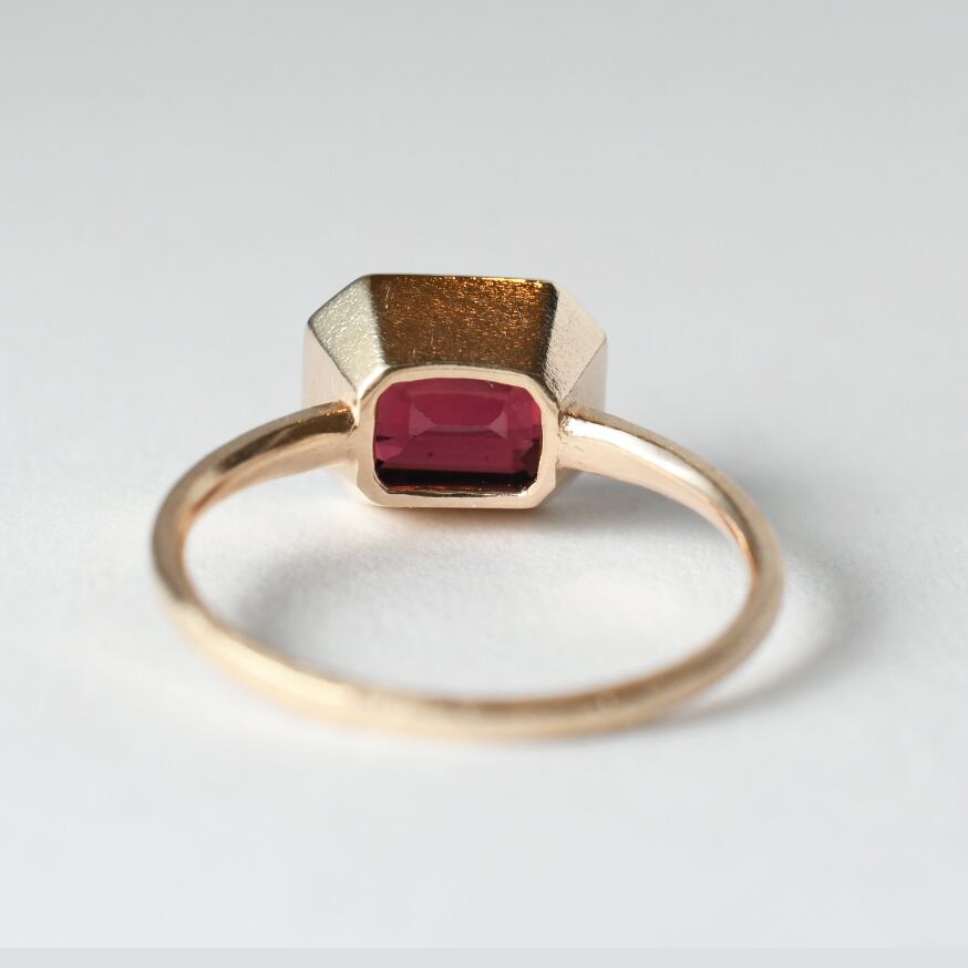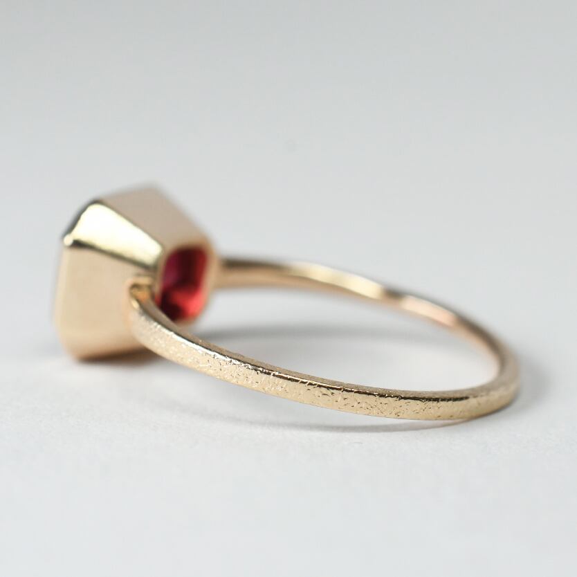こちらのリングは、ガーネットの奥深い色、角ばったシンプルな石座、テクスチャーをつけたアーム部分が相まってアンティークジュエリーのような雰囲気に仕上がっています。